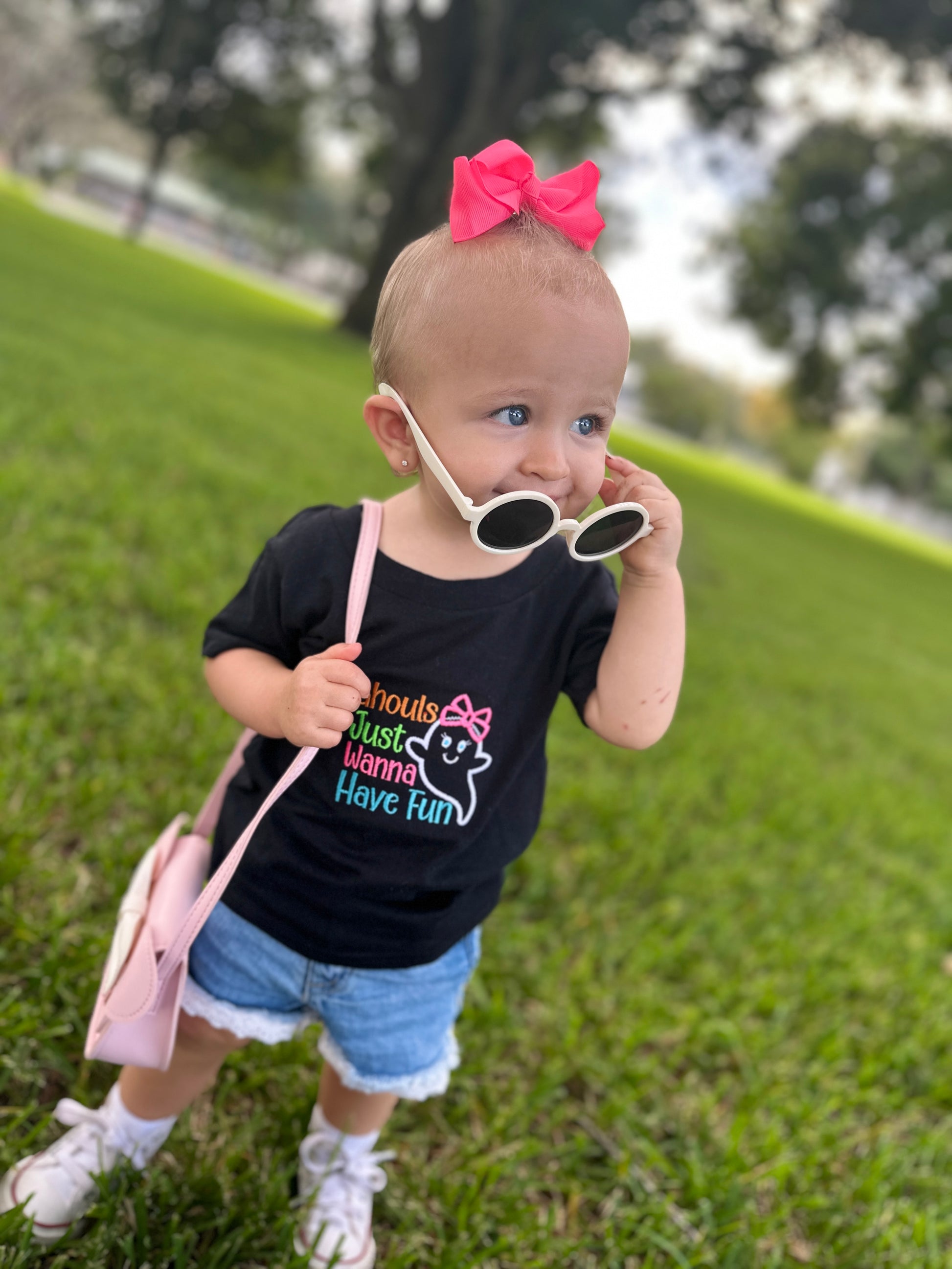 Let their personality shine with our Ghouls Just Wanna Have Fun Halloween tee! This playful design combines cheerful embroidery with a comfy, durable tee - perfect for trick-or-treating, fall photos, or every day in October. Bright colors, soft cotton, and embroidery made to last.