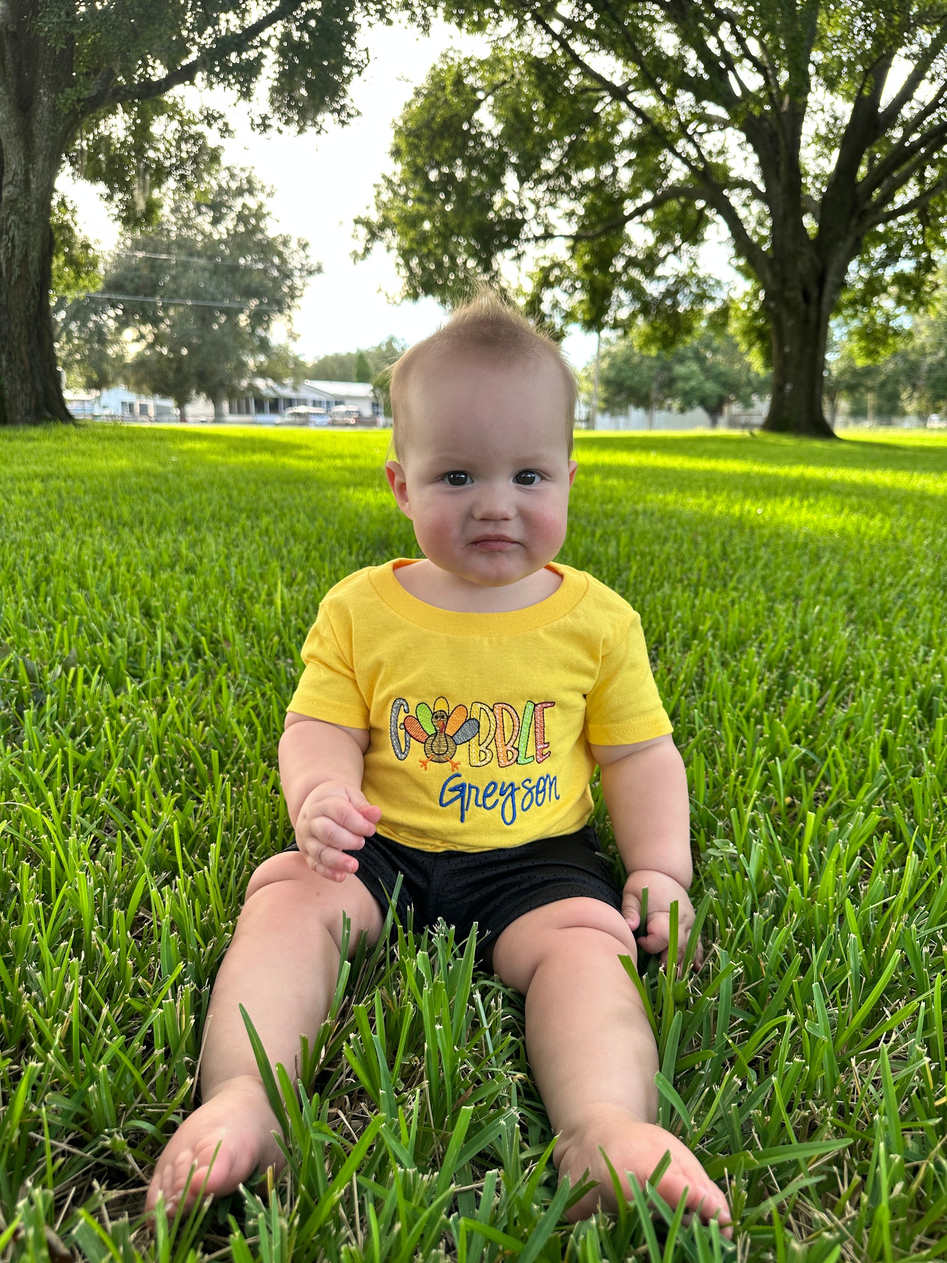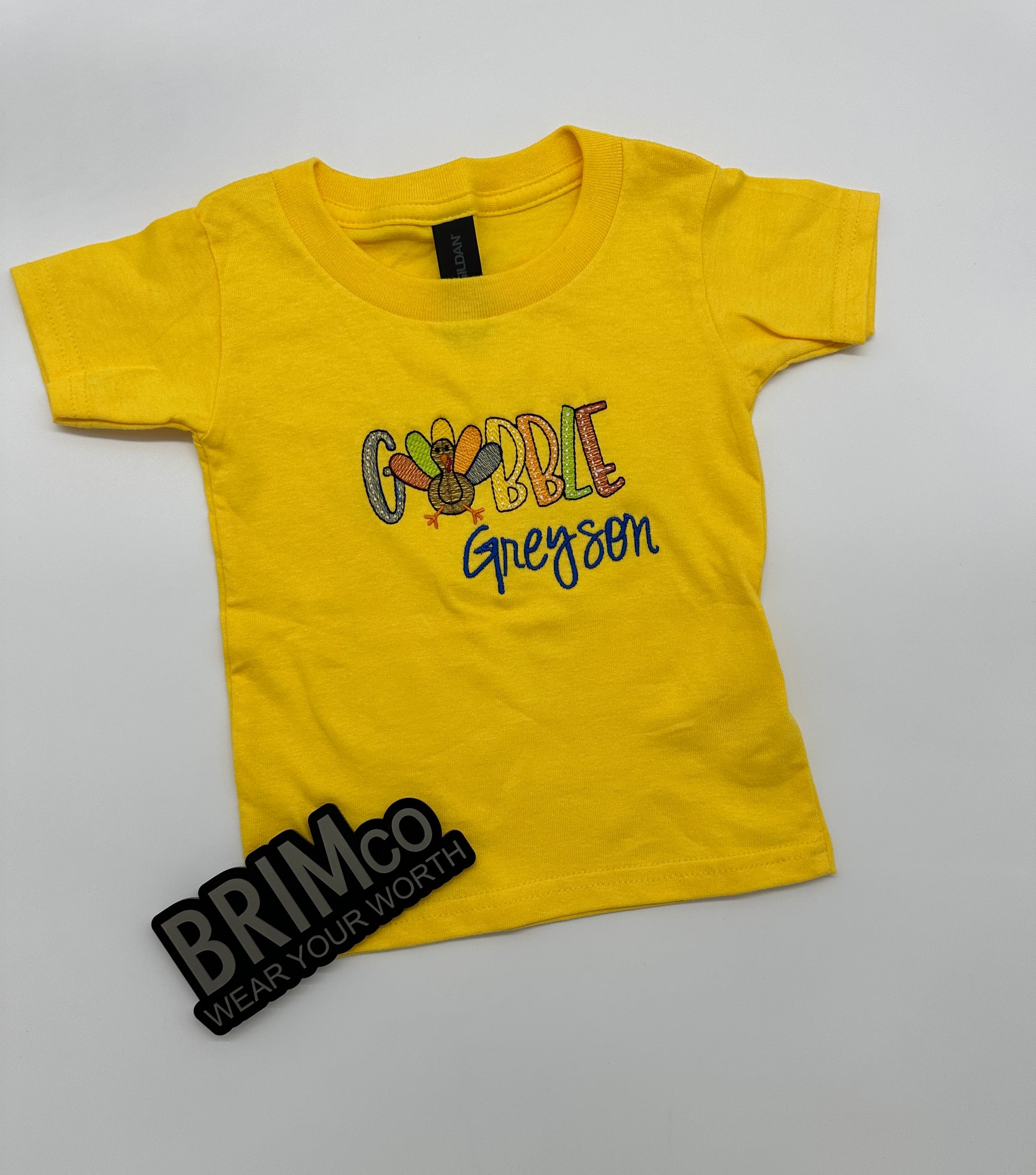 Celebrate Thanksgiving in style with our Gobble Gobble Kids Tee! This playful embroidered shirt is perfect for little ones to show off their holiday spirit - bright colors, a cute turkey, and a comfy fit that makes it perfect for school parties, family photos, or the big Thanksgiving feast.