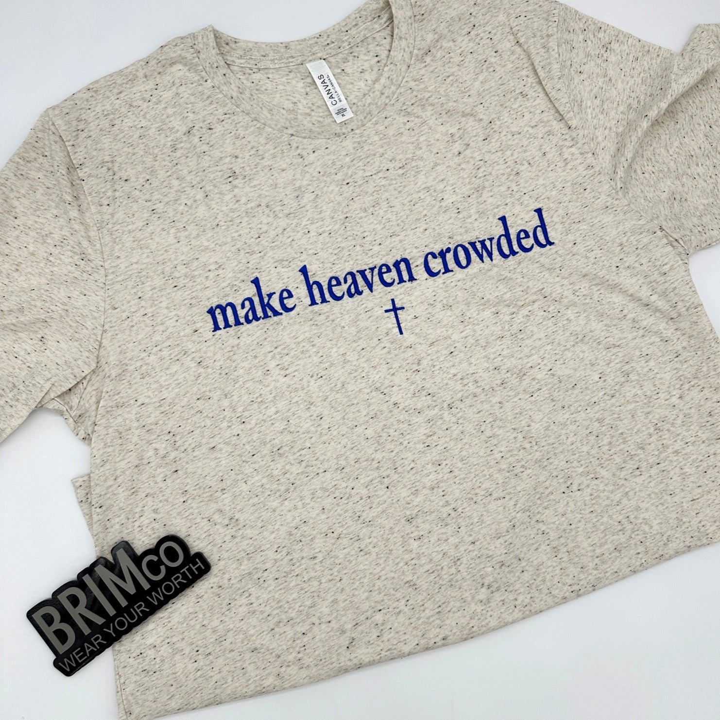 The phrase "Make Heaven Crowded" isn't just words on a shirt - it's a powerful reminder of living with intention, loving people well, and using your life to point to something bigger. Inspired by a message that deeply resonated with us, this tee is about sparking conversations, sharing hope, and wearing your faith with confidence.
